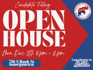 December 8, 2025 4:00 pm - 6:00 pm 716 S Rock St 716 S Rock St, Georgetown, 78626 + Google Map chairman@wilcogop.org