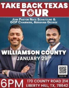 Join us on Thursday, January 29 at 6 p.m. at Vintage Church in Liberty Hill for an evening of boldness and reformation as the church steps up to Take Back Texas by upholding biblical values. Confirmed candidates include: